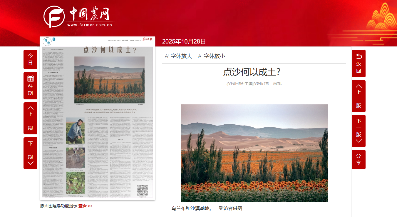 团队资讯:农民日报整版深度报道重庆交通大学沙漠土壤化团队乌兰布和沙漠治理奇迹