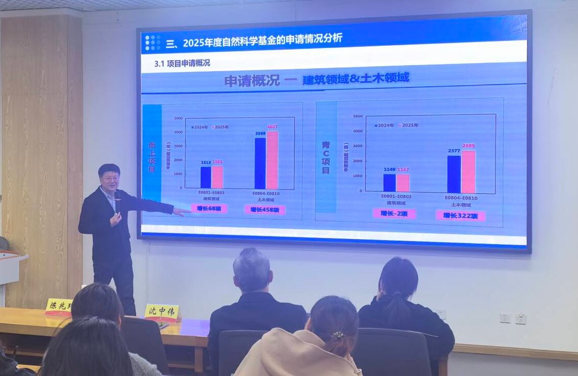 沈中伟教授以《对建筑类学科科学的认识与思考》为题,深入阐述了建筑学、城市规划与风景园林等学科在自然科学基金申报中的定位与路径。他指出,建筑类学科正从经验传承向科学实证转型,强调将设计实践转化为可量化、可验证的科学模型是提升申报成功率的关键。沈教授通过详实数据指出,当前建筑类基金项目中真正体现科学性的不足三成,并分享了其提炼的基金成功率公式,强调前期数据完整性与选题创新度的核心作用,为我校相关学科教师凝练研究方向提供了重要参考。