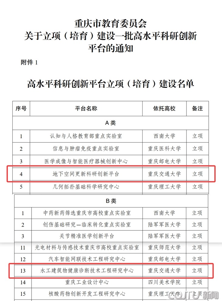 根据《重庆市教育委员会关于做好高水平科研创新平台培育计划申报工作的通知》(渝科教函〔2025〕25号)要求和市教委审议,我校牵头组织申报的“地下空间更新科研创新平台”、“水工建筑物健康诊断技术工程研究中心”分别获批A类平台和B类平台。