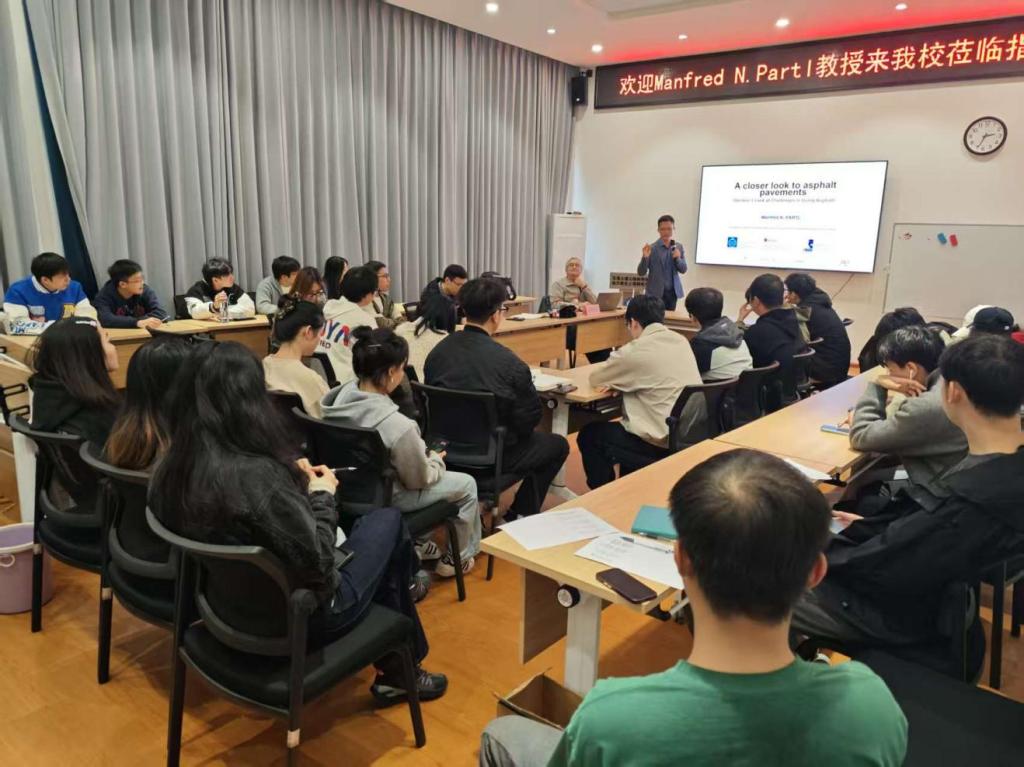 讲座围绕“Challenges of Using Asphalt”“Rheology of Asphalt”和“Case Studies of Asphalt in Europe”三大主题展开。Partl教授系统讲授了沥青材料的结构设计、流变行为、环境适应性及其在欧洲道路工程中的典型实践,结合最新科研成果深入剖析了可持续道路材料的发展趋势,帮助学生拓展国际化学术视野。
