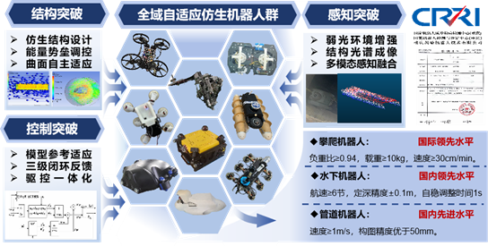 面向交通基础设施的非结构化场景检测,构建“仿生机构-智能感知-群智控制”三位一体的技术体系,以系统性突破检测可达性、感知精度和协同控制三大瓶颈,形成了全域自适应的仿生机器人集群设计、高精度多模态融合感知、机器人集群的高效协作和快速响应等关键技术,实现了多场景下的工程应用。