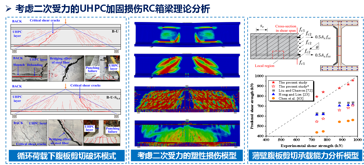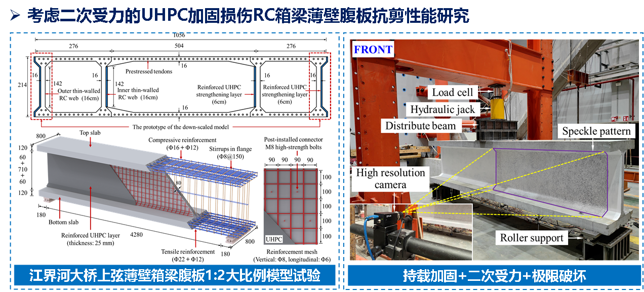 针对桁式组合拱桥薄壁构件壁厚极薄、传统凿毛易致损且界面粘结难的瓶颈,提出了高压水射流低损界面处理工艺,研发了UHPC与高强植筋协同的增强连接技术,揭示了复杂应力下界面剪切失效机理,攻克了薄壁加固中界面易剥离、原结构易损伤的难题,为新旧材料协同受力奠定了基础。针对现役桁式组合拱桥上弦箱梁裂缝频发且加固无法完全卸载的现状,开展了考虑二次受力的UHPC加固损伤RC薄壁箱梁底板/腹板力学性能研究,明确了循环荷载作用下UHPC加固损伤RC薄壁箱梁的受力状态和破坏模式,揭示了初始损伤下UHPC加固带裂缝RC箱梁的裂缝抑制能力,提出了UHPC加固薄壁结构的强韧协同加固技术。针对加固层“应力滞后”导致理论计算偏差大的难题,揭示了二次受力下UHPC加固梁抗弯/抗剪失效机理,建立了考虑滞后应变与残余变形的抗弯/抗剪承载力理论模型,提出了修正承载力计算公式,实现了从局部构件工艺到结构整体性能提升理论的系统性突破,为江界河大桥等危旧桥梁延寿与安全运营提供了核心支撑。核心技术率先在与世界最大跨预应力混凝土桁式组合拱桥(江界河大桥)结构和病害高度相似的斯拉河大桥上进行了实桥工程验证。提出的UHPC加固薄壁结构低损高效界面处理技术,使植筋数量减少50%、界面承载力提高1.6-2.6倍。提出的强韧协同加固技术使上弦箱梁的抗弯和抗剪承载力分别提升88.4%和53.9%以上,抗裂性能提升107.3%,裂缝扩展得到根本抑制,验证了成套技术的可靠性,为江界河大桥的实施奠定了坚实基础。该技术体系的成功应用,不仅消除了试点桥梁的安全隐患,更形成了针对西南地区众多既有桁式拱桥的标准化延寿方案,社会经济效益显著。
