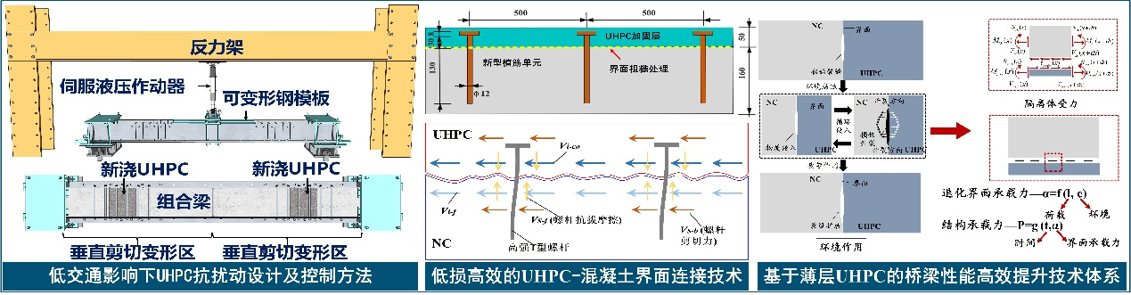 针对传统悬吊式拱桥体系协同转换难,建立了考虑索力增量效应的拱桥吊索更换闭环张拉方法,提出了融合计算机视觉与加速度响应的桥面系动态位移模态测量方法,研发了基于新增整体式钢桁纵梁的桥面体系转换技术。突破了从桥梁局部构件更换到整体性能协同提升的技术瓶颈。针对交通低扰的性能提升方法欠缺,构建了低交通影响下UHPC抗扰动设计及控制方法,提出了低损高效的UHPC-混凝土界面连接技术,建立了基于薄层UHPC的桥梁性能高效提升技术体系,实现了结构性能提升与交通低扰兼顾的突破。最后,针对既有桥梁整跨快速拆建技术及专业设备匮乏,施工效率低、风险高且交通阻断时间长,构建了低交通影响的桥梁快速拆建决策平台,研发了大吨位梁体拆建施工智能控制技术,研制了桥梁快速拆建模块化智能装备,实现了千吨级梁体拆建从粗放式作业到模块化、精准化、智能化的技术升级。研究成果实现了旧危桥梁在低交通影响条件下的高效耐久加固与性能快速提升,显著简化现场施工、缩短交通中断时间,提高了承载力提升效率。项目主要技术创新成果在重庆李家沱长江大桥、重庆郭家沱大桥、湖北光化汉江大桥在内的 300 余座旧危桥梁上得到成功应用,为桥梁结构的安全高效维养提供了科学技术支撑,有效保障了桥梁结构的运营安全,具有广阔的推广应用前景。成果获重庆市科技进步奖二等奖1项。