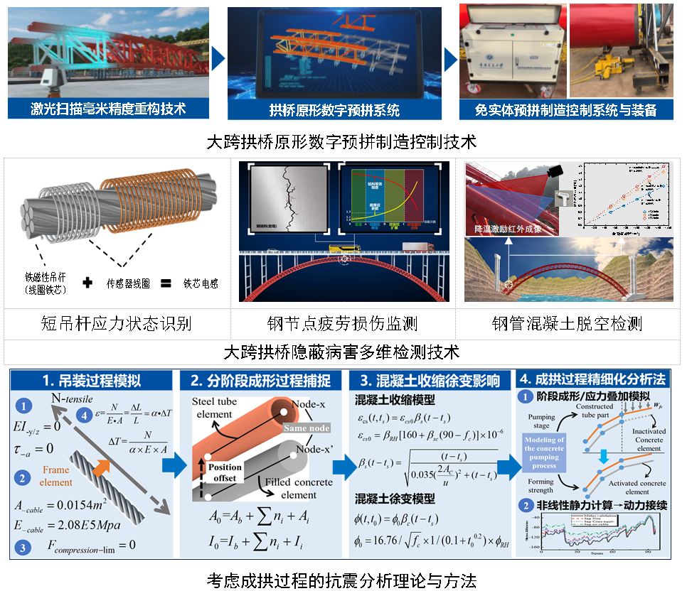 建立了以还原拱肋节段制造构形与相对关系为拼装目标的原形成拱理论,创建了考虑多轮次预拼误差传递的拱桥数字预拼控制技术体系,研发了融合热-形-力全域识别与自动修正的环境自适应安装调控技术与装置,拱肋节段预拼工期缩短25%、场地节约30%,安装调控时间缩短50%。发明了短吊杆应力状态磁谐振识别技术、钢节点疲劳损伤磁记忆监测技术、钢管混凝土拱肋脱空降温激励红外检测技术,提出了考虑局部损伤与拱轴线形双重演化的大跨拱桥结构“体”状态评估方法,实现了拱桥整体性能的快速诊断。率先提出了考虑成拱过程非连续应力叠加效应的大跨拱桥非线性抗震理论与方法,开发了大跨拱桥专用抗震分析软件,自主研制了主拱超长防屈曲横撑、拱上建筑电磁惯质阻尼器等高适应性耗能减震装置,建立了“震损路径预调控+耗能装置可牺牲”的大跨拱桥抗震韧性多维提升技术,抗震冗余度提升30%,填补了大跨拱桥考虑成拱过程的抗震分析理论和方法的空白。成果支撑了世界最大跨上承式钢管混凝土拱桥—贵州德余乌江特大桥、世界最大跨双连拱桥—重庆双堡特大桥等4座世界级拱桥的精准快速成拱,500m 级拱桥合龙精度优于两毫米;支撑了包括重庆巫山长江大桥、云南怒江特大桥在内的100余座拱桥服役状态的精准感知与诊断,钢管混凝土灌注时单根拱肋检测时间小于20分钟,检测时间缩短90%以上;成果解决了荞窝特大桥、金沙江大桥两座位于近断层强震区的大跨钢管混凝土拱桥的抗震设计与韧性提升难题,显著提升抗震冗余度37%。成果获重庆市科技进步奖一等奖1项。