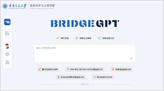 构建了涵盖综合业务管理、大数据可视化展示、大数据分析服务以及智能管养终端的大数据分析云平台,实现了近4000座桥梁检测、监测等全要素数据集成,率先形成了区域化桥梁管养大数据分析云平台,实现了管养信息交互共享与辅助决策。以该平台为基础,并研发了桥梁智能管养领域大模型BridgeGPT,实现了桥梁管养领域常识问答、病害处置建议、病害成因分析的领域知识可引证问答功能。该大模型基于检索增强生成(RAG)技术,融合了200余本桥梁管养领域关键行业规范,可适配智谱GLM4、DeepSeek、QWen等多类型基座大模型,并引入领域知识库实现高质量智能问答。系列成果获国家发明专利5项、软件著作权10余项,发表学术论文20余篇,获得重庆市科技进步二等奖。