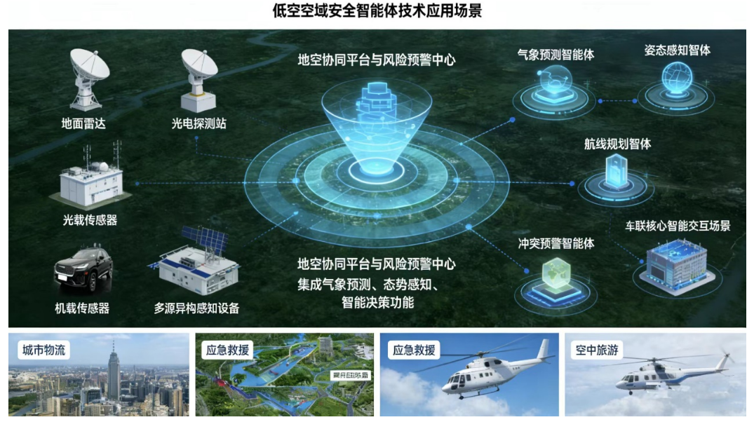 围绕“感知—研判—决策—预警—管控”全链条构建了地空协同低空空域安全智能体与风险预警平台。平台集成多源异构感知、气象预测、态势感知、航线规划、冲突预警等核心能力,形成面向复杂低空场景的智能化安全管控体系,建高质量数据集、研发空域安全智能体,并搭建地空协同平台和风险预警中心,可支撑城市物流、应急救援、空中游览等典型应用场景下的飞行风险识别、任务协同与运行保障。